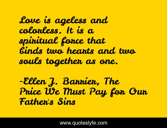This page presents the quote "Love is ageless and colorless. It is a spiritual force that binds two hearts and two souls together as one.". Author of this quote is Ellen J. Barrier, The Price We Must Pay for Our Father's Sins. This quote is about couples, spiritual, inspirations, love, relationship, power, colorless, binding, souls,.