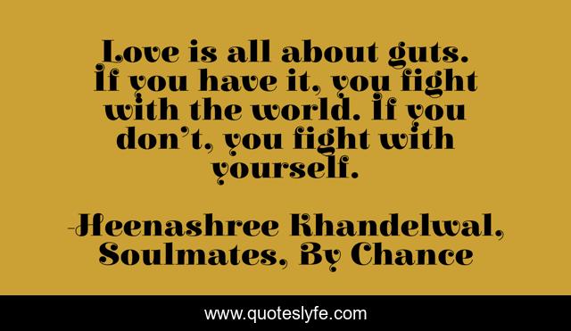 This page presents the quote "Love is all about guts. If you have it, you fight with the world. If you don’t, you fight with yourself.". Author of this quote is Heenashree Khandelwal, Soulmates, By Chance. This quote is about love, guts, soulmates, affection, soulmates-by-chance,.