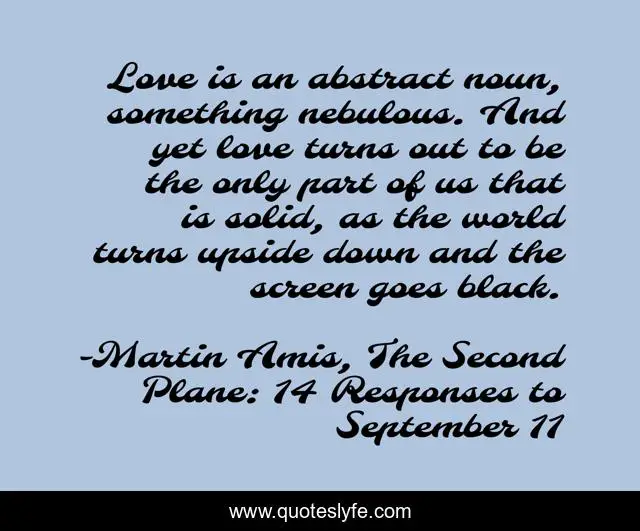 This page presents the quote "Love is an abstract noun, something nebulous. And yet love turns out to be the only part of us that is solid, as the world turns upside down and the screen goes black.". Author of this quote is Martin Amis, The Second Plane: 14 Responses to September 11. This quote is about love, affection,.