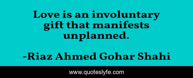 This page presents the quote "Love is an involuntary gift that manifests unplanned.". Author of this quote is Riaz Ahmed Gohar Shahi. This quote is about spiritual-growth, life, love, love-and-sayings, gift, religion, gnostic, mystic, sufi,.