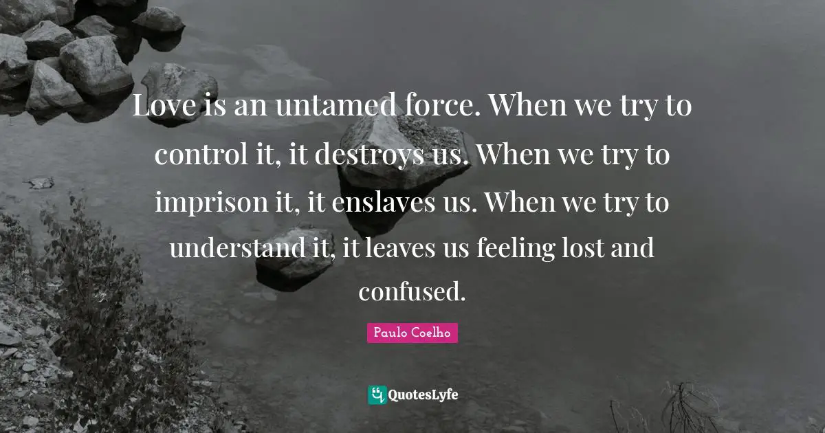 This page presents the quote "Love is an untamed force. When we try to control it, it destroys us. When we try to imprison it, it enslaves us. When we try to understand it, it leaves us feeling lost and confused.". Author of this quote is Paulo Coelho. This quote is about love, affection,.