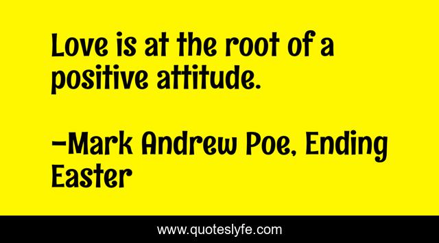 This page presents the quote "Love is at the root of a positive attitude.". Author of this quote is Mark Andrew Poe, Ending Easter. This quote is about confidence, love, positive, behaviour, attitude, affection, harry-moon,.