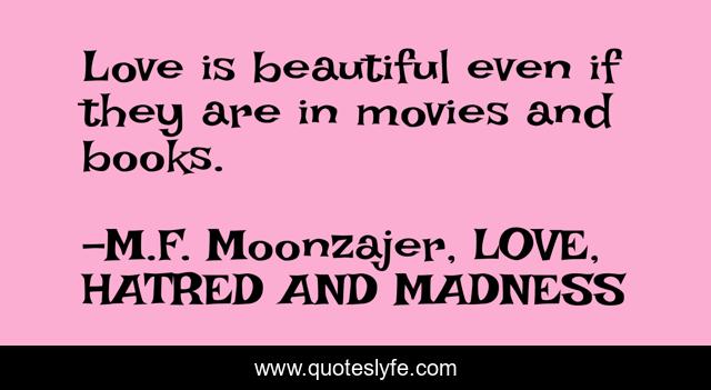 This page presents the quote "Love is beautiful even if they are in movies and books.". Author of this quote is M.F. Moonzajer, LOVE, HATRED AND MADNESS. This quote is about beautiful, movies, books, love, affection,.