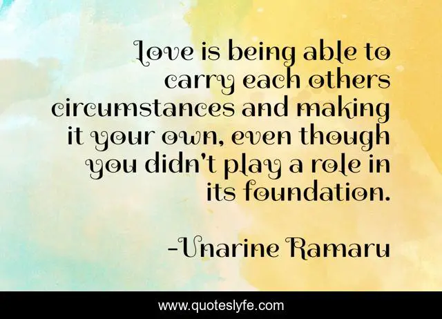 This page presents the quote "Love is being able to carry each others circumstances and making it your own, even though you didn't play a role in its foundation.". Author of this quote is Unarine Ramaru. This quote is about relationships, love, circumstance, commitment, devotion, affection,.
