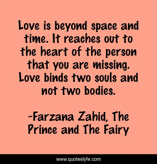 This page presents the quote "Love is beyond space and time. It reaches out to the heart of the person that you are missing. Love binds two souls and not two bodies.". Author of this quote is Farzana Zahid, The Prince and The Fairy. This quote is about heart, love, bookworm, prince, note, lovers, rose, romance, wattpadlife,.