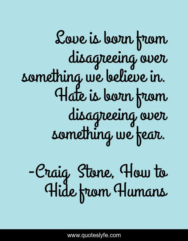 This page presents the quote "Love is born from disagreeing over something we believe in. Hate is born from disagreeing over something we fear.". Author of this quote is Craig Stone, How to Hide from Humans. This quote is about life, love, peace, hate, war, affection,.