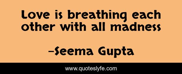 This page presents the quote "Love is breathing each other with all madness". Author of this quote is Seema Gupta. This quote is about broken-heart, life, lonely, love, divine-love, heartbreak, passion, deep-love, inspirational,.