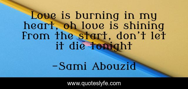 This page presents the quote "Love is burning in my heart, oh love is shining from the start, don’t let it die tonight". Author of this quote is Sami Abouzid. This quote is about love, affection,.