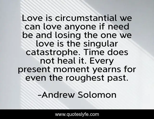 This page presents the quote "Love is circumstantial we can love anyone if need be and losing the one we love is the singular catastrophe. Time does not heal it. Every present moment yearns for even the roughest past.". Author of this quote is Andrew Solomon. This quote is about loss, circumstantial, love, catastrophe, past, heal, grief, yearning, present,.