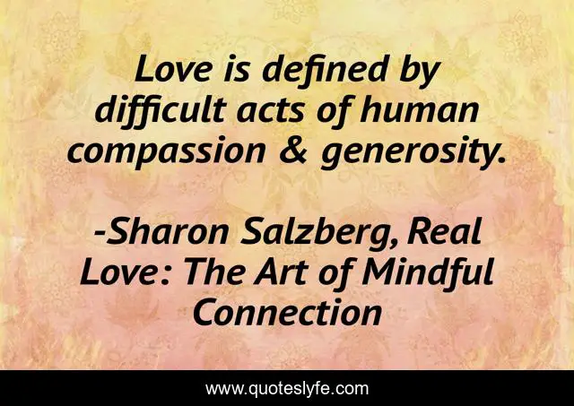 This page presents the quote "Love is defined by difficult acts of human compassion & generosity.". Author of this quote is Sharon Salzberg, Real Love: The Art of Mindful Connection. This quote is about love, mindfulness, compassion, generosity, meditation, real-love, affection,.