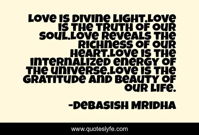 This page presents the quote "Love is divine light.Love is the truth of our soul.Love reveals the richness of our heart.Love is the internalized energy of the universe.Love is the gratitude and beauty of our life.". Author of this quote is Debasish Mridha. This quote is about heart, debasish, love, love-is-the-gratitude, mridha, philosophy, debasish-mridha, beauty-of-our-life, energy-of-the-universe,.