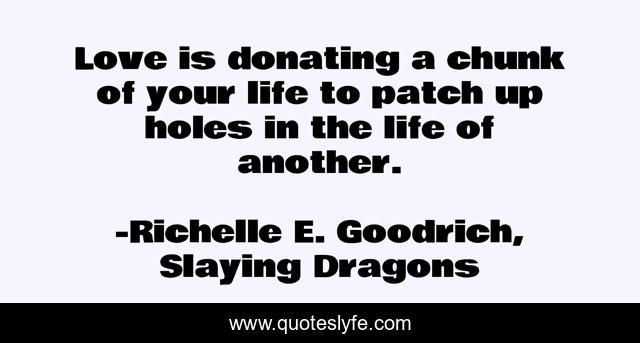 This page presents the quote "Love is donating a chunk of your life to patch up holes in the life of another.". Author of this quote is Richelle E. Goodrich, Slaying Dragons. This quote is about caring, life, love, giving, richelle-e-goodrich, helping, richelle, loving-others, richelle-goodrich,.