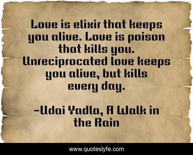 This page presents the quote "Love is elixir that keeps you alive. Love is poison that kills you. Unreciprocated love keeps you alive, but kills every day.". Author of this quote is Udai Yadla, A Walk in the Rain. .