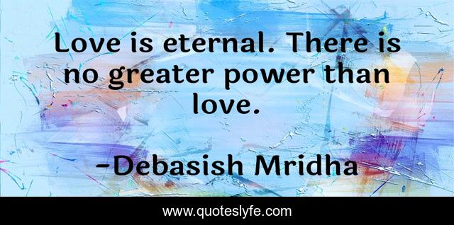 This page presents the quote "Love is eternal. There is no greater power than love.". Author of this quote is Debasish Mridha. This quote is about love, no-greater-power, philosophy, debasish-mridha, power-of-love, quotes, love-is-eternal, debasish-mridha-md, inspirational,.