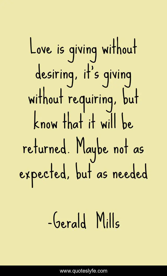 This page presents the quote "Love is giving without desiring, it's giving without requiring, but know that it will be returned. Maybe not as expected, but as needed". Author of this quote is Gerald Mills. This quote is about desire, love, affection,.