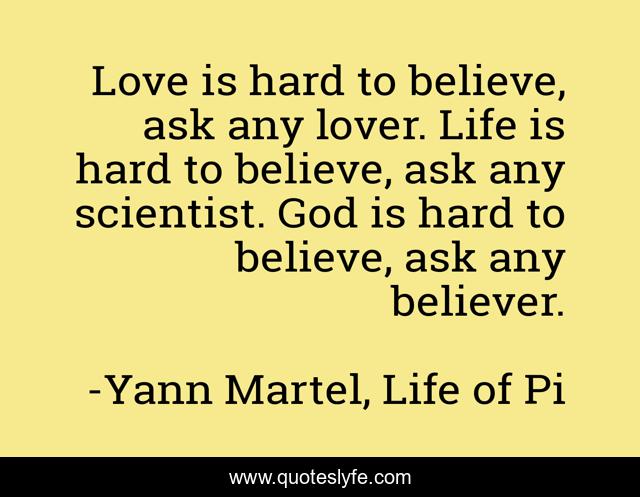 This page presents the quote "Love is hard to believe, ask any lover. Life is hard to believe, ask any scientist. God is hard to believe, ask any believer.". Author of this quote is Yann Martel, Life of Pi. This quote is about belief, life-of-pi,.