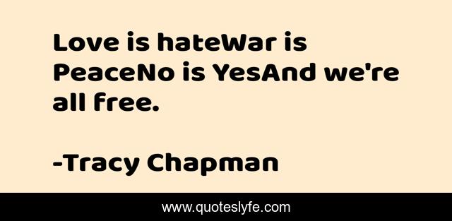 This page presents the quote "Love is hateWar is PeaceNo is YesAnd we're all free.". Author of this quote is Tracy Chapman. This quote is about love, peace, free, yes, hate, war, affection,.