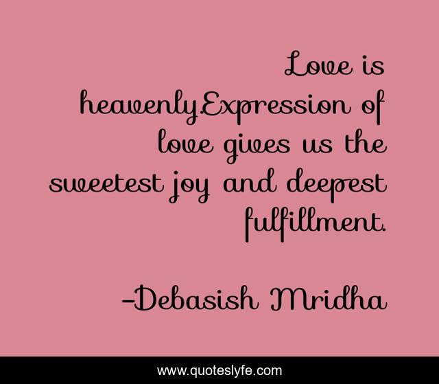 This page presents the quote "Love is heavenly.Expression of love gives us the sweetest joy and deepest fulfillment.". Author of this quote is Debasish Mridha. This quote is about life, love, knowledge, inspirational, intelligence, philosophy, wisdom, quotes, affection,.