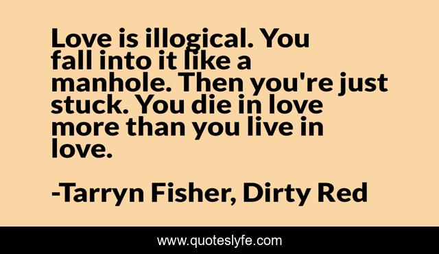 This page presents the quote "Love is illogical. You fall into it like a manhole. Then you're just stuck. You die in love more than you live in love.". Author of this quote is Tarryn Fisher, Dirty Red. This quote is about love, love-me-with-lies, leah, caleb, dirty-red, olivia, affection,.