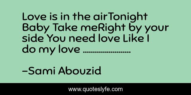 This page presents the quote "Love is in the airTonight Baby Take meRight by your side You need love Like I do my love ……………………". Author of this quote is Sami Abouzid. This quote is about love, affection,.