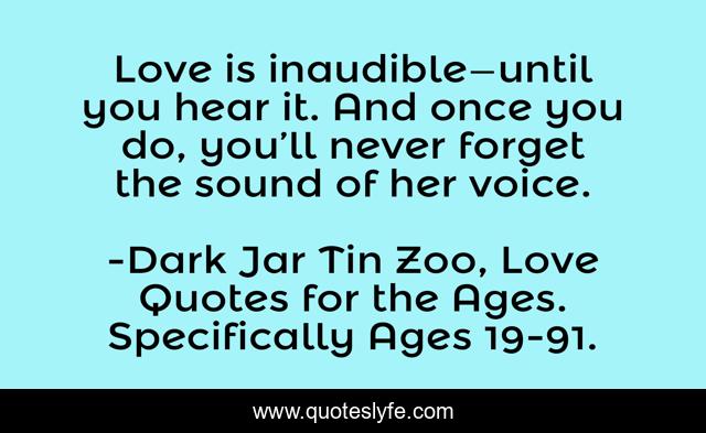 This page presents the quote "Love is inaudible—until you hear it. And once you do, you’ll never forget the sound of her voice.". Author of this quote is Dark Jar Tin Zoo, Love Quotes for the Ages. Specifically Ages 19-91.. This quote is about relationships, sound, love, forget, listen, amy, hear, memory, voice,.