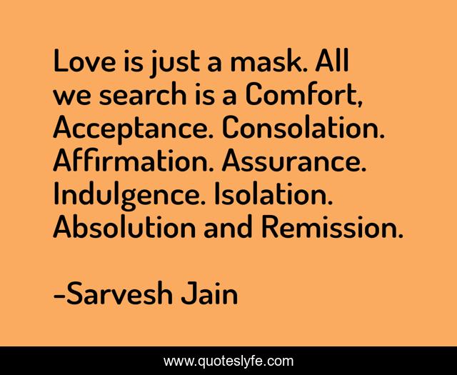 This page presents the quote "Love is just a mask. All we search is a Comfort, Acceptance. Consolation. Affirmation. Assurance. Indulgence. Isolation. Absolution and Remission.". Author of this quote is Sarvesh Jain. This quote is about confidence, love, author, quote, motivational, emotions, reality, optimistic, inspirational,.