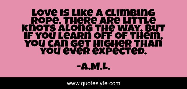 This page presents the quote "Love is like a climbing rope. There are little knots along the way, but if you learn off of them, you can get higher than you ever expected.". Author of this quote is A.M.L.. This quote is about love, metaphor, affection,.