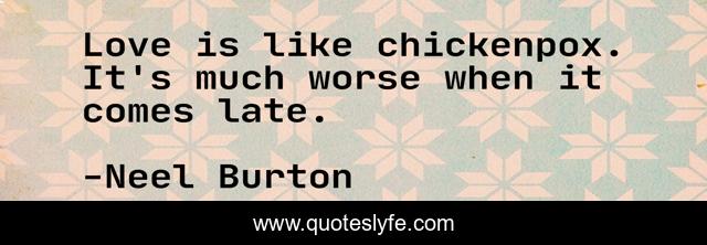 This page presents the quote "Love is like chickenpox. It's much worse when it comes late.". Author of this quote is Neel Burton. This quote is about relationships, love, humour, disease, romance, truth, affection,.
