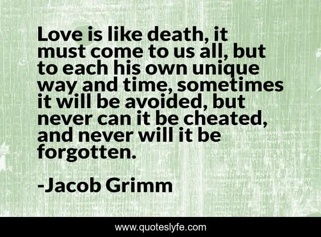 This page presents the quote "Love is like death, it must come to us all, but to each his own unique way and time, sometimes it will be avoided, but never can it be cheated, and never will it be forgotten.". Author of this quote is Jacob Grimm. .