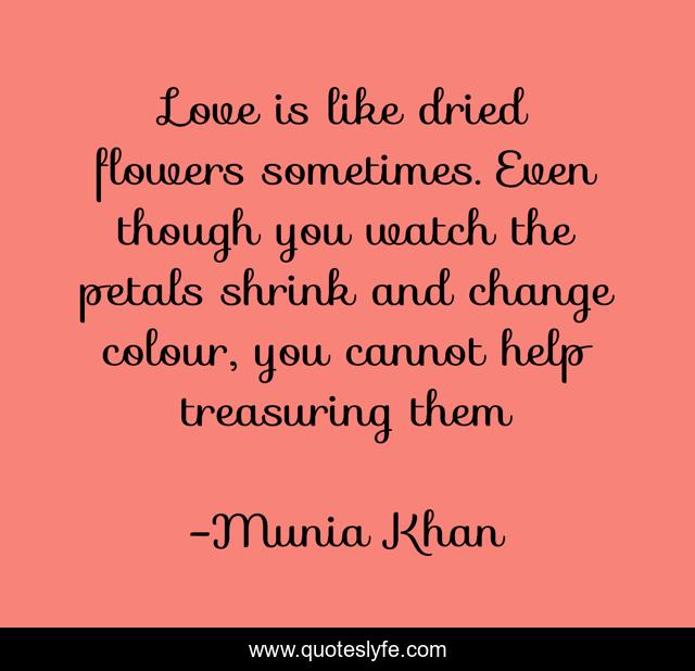 This page presents the quote "Love is like dried flowers sometimes. Even though you watch the petals shrink and change colour, you cannot help treasuring them". Author of this quote is Munia Khan. This quote is about flower, love, help, petals, petal, colour, sometimes, watch, change,.