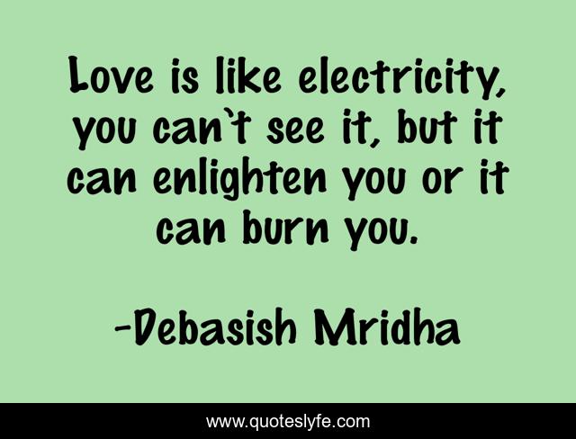 This page presents the quote "Love is like electricity, you can’t see it, but it can enlighten you or it can burn you.". Author of this quote is Debasish Mridha. This quote is about debasish, love, mridha, philosophy, debasish-mridha, inspirational, enthusiasm, affection, love-is-like-electricity,.