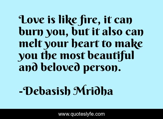 This page presents the quote "Love is like fire, it can burn you, but it also can melt your heart to make you the most beautiful and beloved person.". Author of this quote is Debasish Mridha. This quote is about life, love, knowledge, inspirational, intelligence, philosophy, wisdom, quotes, affection,.