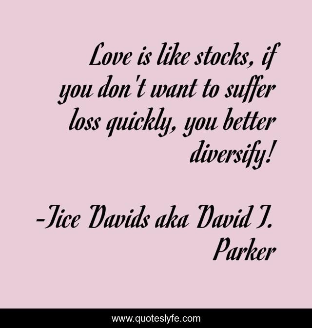 This page presents the quote "Love is like stocks, if you don't want to suffer loss quickly, you better diversify!". Author of this quote is Tice Davids aka David T. Parker. This quote is about love, relationship, relationship-advice, wall-street, stocks, affection,.