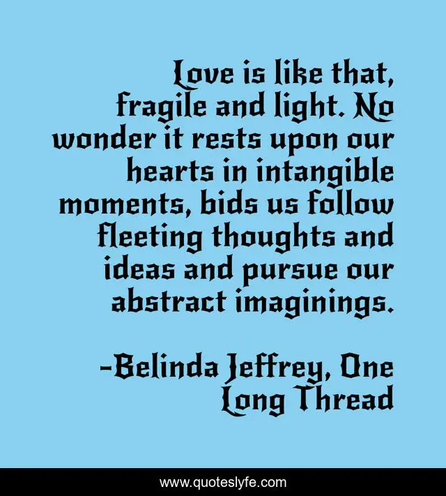 This page presents the quote "Love is like that, fragile and light. No wonder it rests upon our hearts in intangible moments, bids us follow fleeting thoughts and ideas and pursue our abstract imaginings.". Author of this quote is Belinda Jeffrey, One Long Thread. This quote is about love, light, fragile, ideas, intangible, fleeting-thoughts, hearts, abstract-imaginings, affection,.
