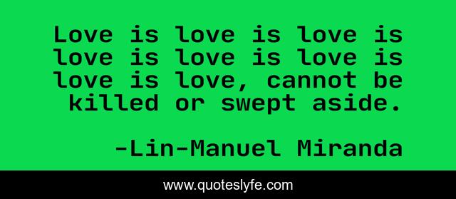 This page presents the quote "Love is love is love is love is love is love is love is love, cannot be killed or swept aside.". Author of this quote is Lin-Manuel Miranda. This quote is about lgbt, tonys, love, affection,.