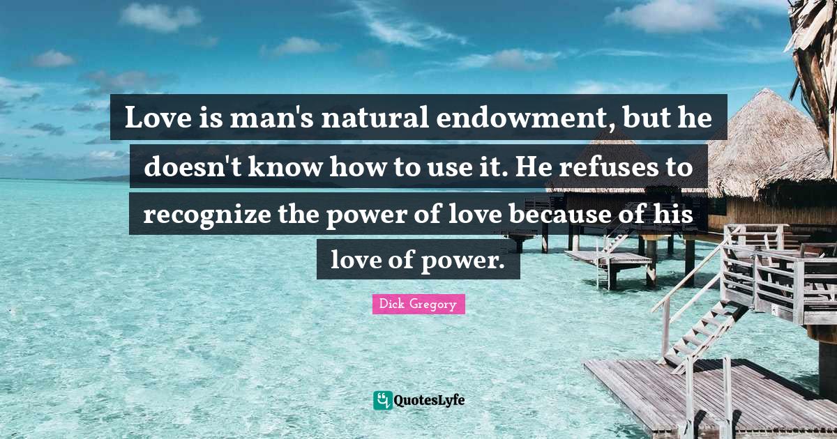 This page presents the quote "Love is man's natural endowment, but he doesn't know how to use it. He refuses to recognize the power of love because of his love of power.". Author of this quote is Dick Gregory. This quote is about love is, use, natural, know how, his love, power, fun, endowment, wisdom,.