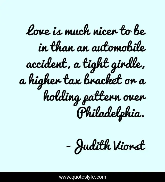 This page presents the quote "Love is much nicer to be in than an automobile accident, a tight girdle, a higher tax bracket or a holding pattern over Philadelphia.". Author of this quote is Judith Viorst. This quote is about tax, philadelphia, love is,.