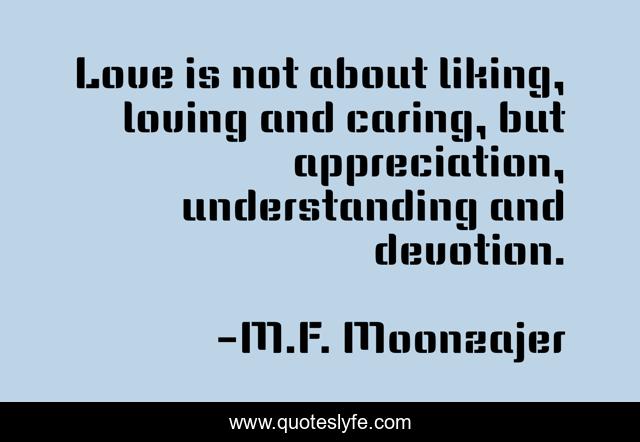 This page presents the quote "Love is not about liking, loving and caring, but appreciation, understanding and devotion.". Author of this quote is M.F. Moonzajer. This quote is about caring, appreciation, loving,.