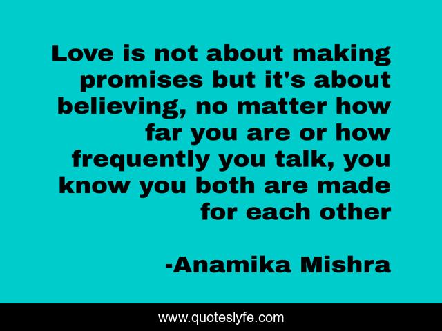 This page presents the quote "Love is not about making promises but it's about believing, no matter how far you are or how frequently you talk, you know you both are made for each other". Author of this quote is Anamika Mishra. This quote is about relationships, love, first-love, feelings, long-distance-relationship, affection,.