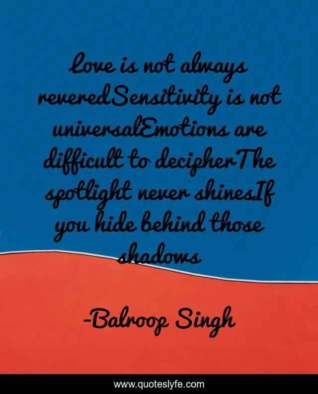 This page presents the quote "Love is not always reveredSensitivity is not universalEmotions are difficult to decipherThe spotlight never shinesIf you hide behind those shadows". Author of this quote is Balroop Singh. This quote is about respect, sensitivity, love, affection,.