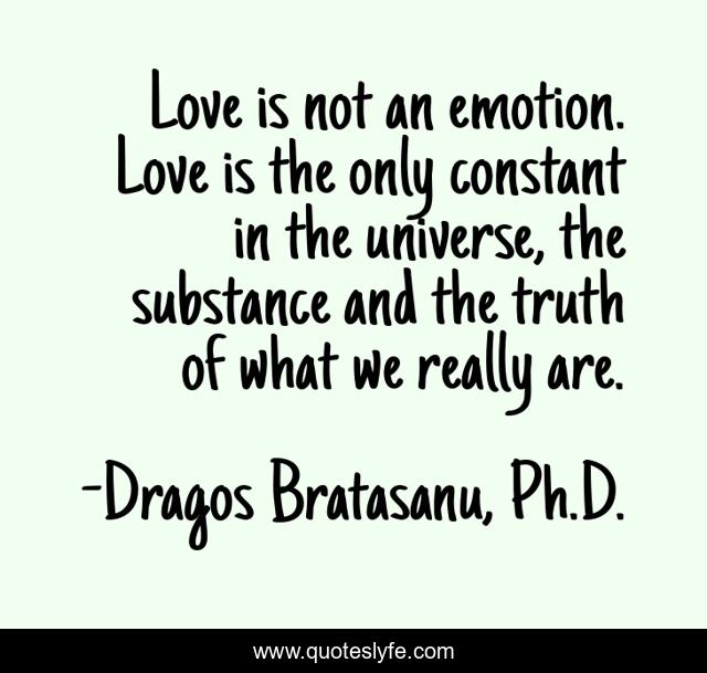 This page presents the quote "Love is not an emotion. Love is the only constant in the universe, the substance and the truth of what we really are.". Author of this quote is Dragos Bratasanu, Ph.D.. This quote is about love, truth, affection, emotions,.