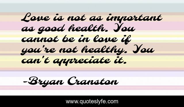 This page presents the quote "Love is not as important as good health. You cannot be in love if you're not healthy. You can't appreciate it.". Author of this quote is Bryan Cranston. This quote is about good, love, affection, love is,.