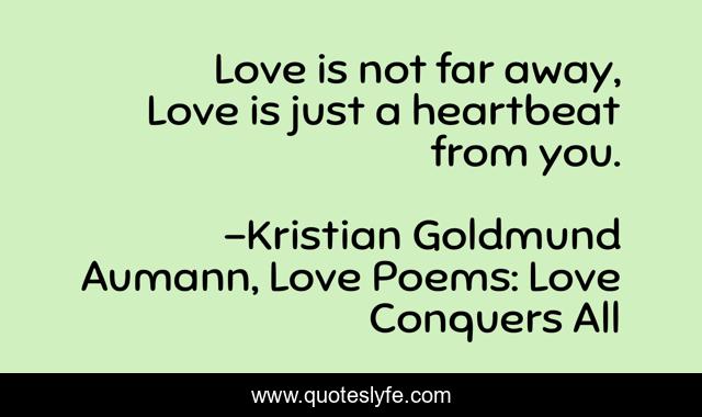 This page presents the quote "Love is not far away, Love is just a heartbeat from you.". Author of this quote is Kristian Goldmund Aumann, Love Poems: Love Conquers All. This quote is about love, affection,.