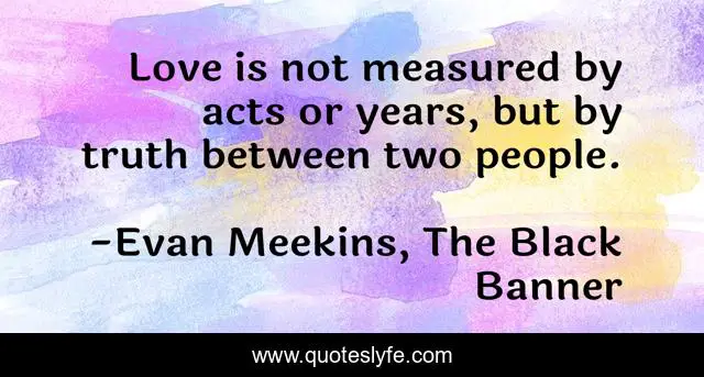 This page presents the quote "Love is not measured by acts or years, but by truth between two people.". Author of this quote is Evan Meekins, The Black Banner. This quote is about love, fantasy-fiction, fiction, fantasy, young-adult-fiction, truth, young-adult, young-adult-fantasy, affection,.