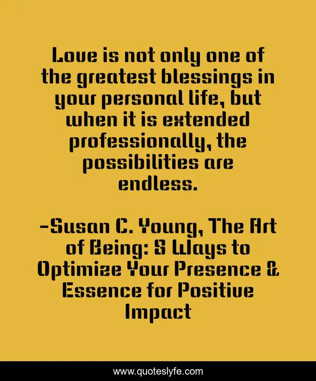 This page presents the quote "Love is not only one of the greatest blessings in your personal life, but when it is extended professionally, the possibilities are endless.". Author of this quote is Susan C. Young, The Art of Being: 8 Ways to Optimize Your Presence & Essence for Positive Impact. This quote is about confidence, susan-young, relationship, communication-skills, passionate-living, communication, generosity, first-impressions, integrity,.