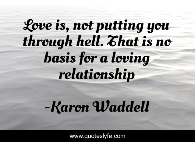 This page presents the quote "Love is, not putting you through hell. That is no basis for a loving relationship". Author of this quote is Karon Waddell. This quote is about love, love-and-sayings, quotes, loving-one-another, quotes-about-love, loving-someone, affection,.