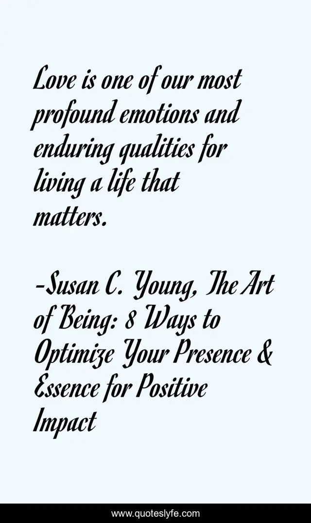 This page presents the quote "Love is one of our most profound emotions and enduring qualities for living a life that matters.". Author of this quote is Susan C. Young, The Art of Being: 8 Ways to Optimize Your Presence & Essence for Positive Impact. This quote is about confidence, susan-young, relationship, communication-skills, passionate-living, communication, first-impressions, authenticity, integrity,.