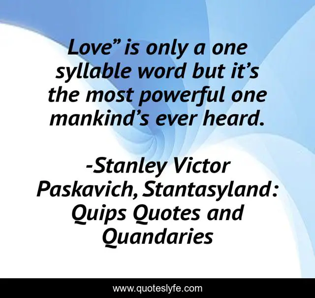 This page presents the quote "Love” is only a one syllable word but it’s the most powerful one mankind’s ever heard.". Author of this quote is Stanley Victor Paskavich, Stantasyland: Quips Quotes and Quandaries. This quote is about love, beauty, power, peace, serenity, affection,.