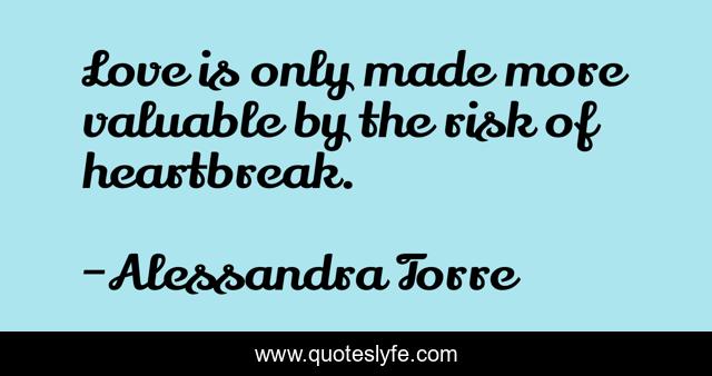 This page presents the quote "Love is only made more valuable by the risk of heartbreak.". Author of this quote is Alessandra Torre. This quote is about true-love, love, romance, heartbreak, anguish, affection,.