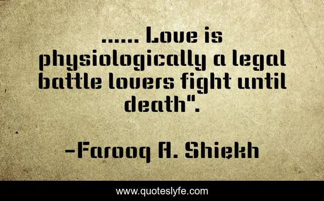 This page presents the quote "...... Love is physiologically a legal battle lovers fight until death".". Author of this quote is Farooq A. Shiekh. This quote is about love-rules, love, love-conquers-all, lovers-love-story, epinephrine, emotions, love-attraction, love-endlessly, other-emotional-hormones,.